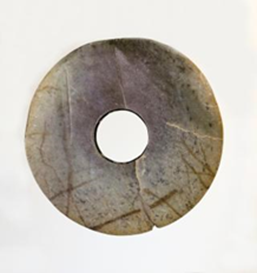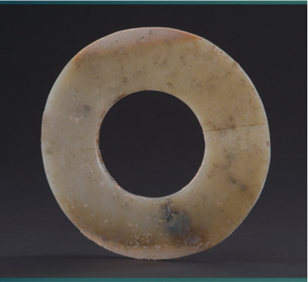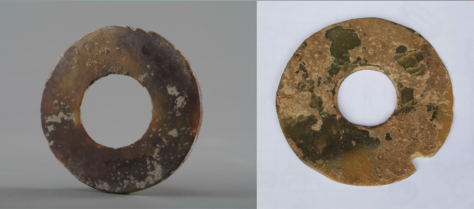 玉璧(编号总0129:5)直经9厘米,单面钻孔,大端孔径4.4厘米,小端孔径4厘米,厚度0.55—0.7厘米,璧外缘有磕碰痕。