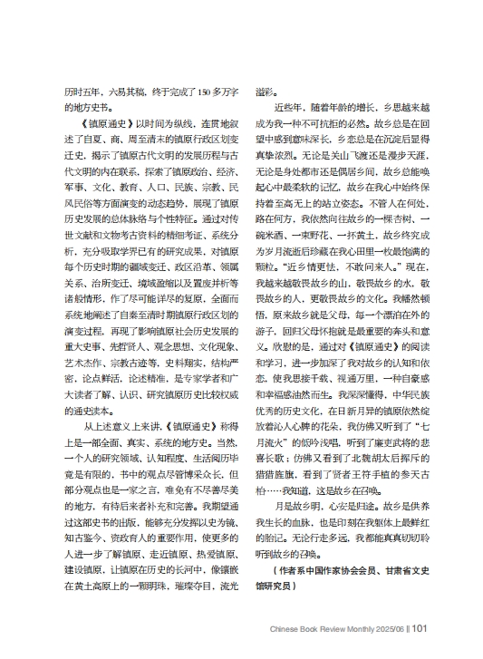 从上述意义上来讲,《镇原通史》称得上是一部全面、真实、系统的地方史。当然,一个人的研究领域、认知程度、生活阅历毕竟是有限的,书中的观点尽管博采众长,但部分观点也是一家之言,难免有不尽善尽美的地方,有待后来者补充和完善。我期望通过这部史书的出版,能够充分发挥以史为镜、知古鉴今、资政育人的重要作用,使更多的人进一步了解镇原、走近镇原、热爱镇原、建设镇原,让镇原在历史的长河中,像镶嵌在黄土高原上的一颗明珠,璀璨夺目,流光溢彩。
