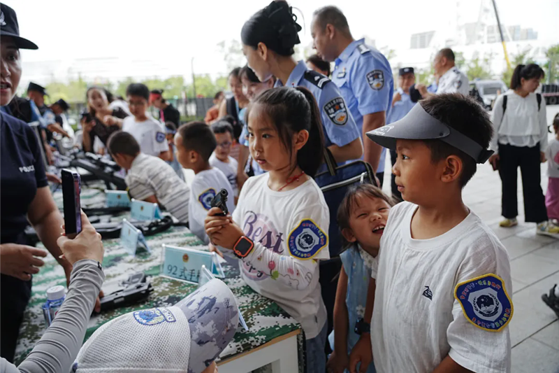 带着兴奋和期待,小朋友们的警营探索之旅开始了!在奥体中心警务站和警航作战单元,他们沉浸式参观了现代警务工作和警用无人机的指挥调度,直观了解了公安工作的日常场景。另一边,小朋友们在民警的指导下,一个个亲手拿着警用武器装备零距离“拍照打卡”,“这个好酷!”“看我的!”小朋友们的惊叹声此起彼伏。