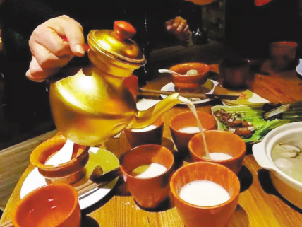 喝酥油茶所用的茶具也非常讲究,所用的壶大多为金属制品,比如银壶、铜壶、铝壶、瓷铁彩花壶等,壶嘴、壶把造型别致,壶的颈腹部大多绘有彩色民族图案;所使用的茶碗则大多为木制或是陶瓷制品,上面有银或是铜镶嵌。