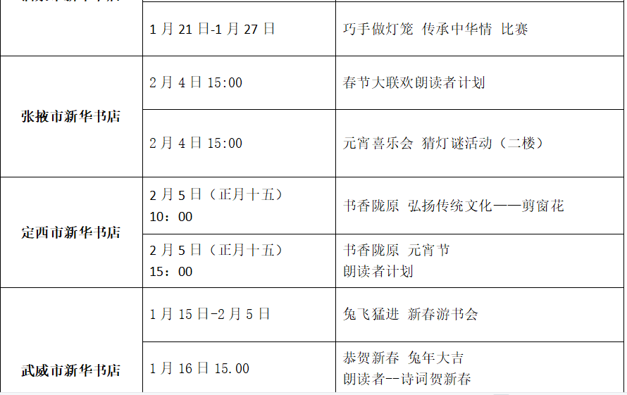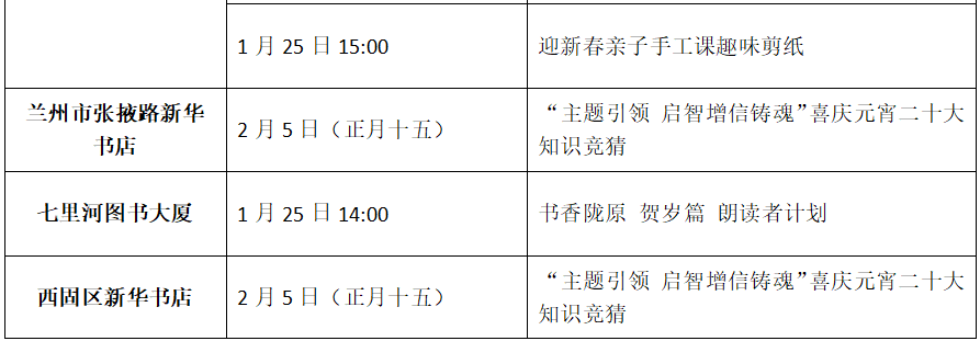 来书店看一场免费电影,放松心情兔年再接再厉;听阅读大使分享故事,点亮陇原文化之光;剧本游戏玩个刺激和新鲜;学做灯笼、学剪纸弘扬传统文化,树立民族自信;吃元宵团团圆圆过个祥和年。