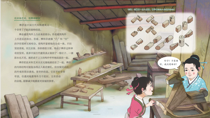 书中提到了在墙面削个角、弄个弯,“拐弯抹角”、方便大家行走的谦让智慧;齐心协力,共同出资出力盖房子的和谐智慧;技术和艺术并存,用榫卯联结构件的建构智慧;防患于未然,保证人们生命、生活安全的防患智慧……