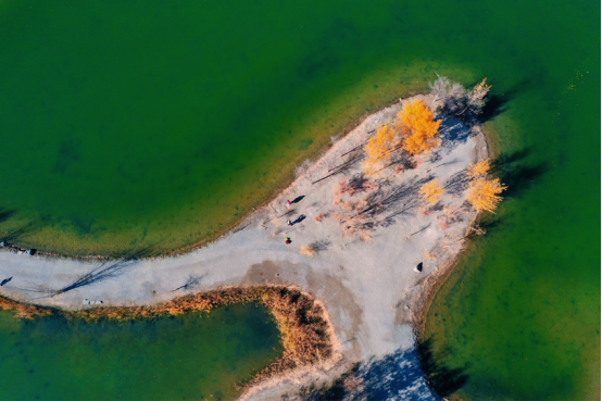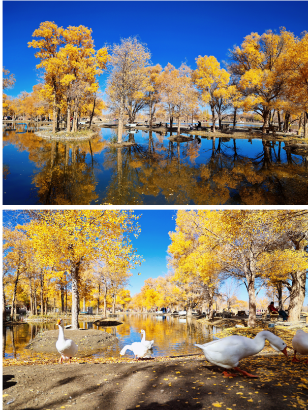 金波湖是金塔胡杨林的心脏,是临水胡杨的最佳拍摄地之一。湖面倒映着胡杨高大的身影,多姿的树干,黄色的树叶,都毫不保留地在水中展示出来。小桥流水、碧波荡漾、白鹅嬉戏,若不是周边金黄色的胡杨提醒,会让人误以为来到了江南水乡。