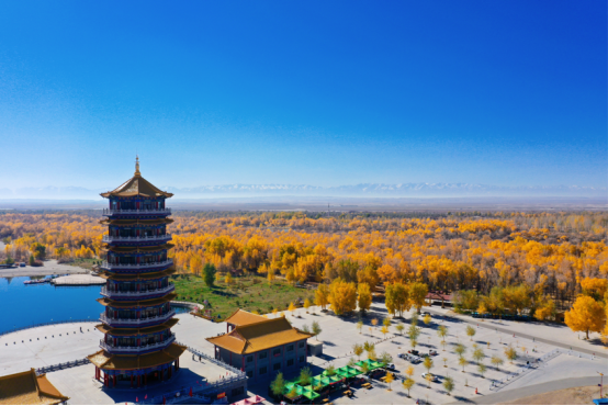 胡杨楼位于胡杨林英雄树东侧,是一座仿古式七层瞭望塔,在塔下你可以感受古建筑与大漠胡杨艺术碰撞的魅力,登上胡杨楼,但见胡杨参天、碧水环流,层林尽染,让人流连忘返。登上烽燧瞭望台,胡杨风骨,沙枣清香,红柳婀娜,大漠苍凉,远山绮丽,尽收眼底。