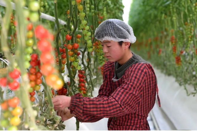 在古浪县黄花滩生态移民区富民新村现代化智能玻璃温室,村民在管护番茄 范培珅 摄