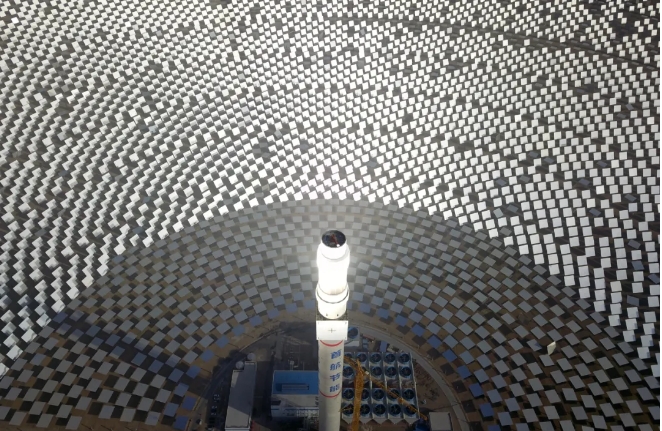 人们惊呼,这是自然力与人类智慧的完美创造:戈壁荒滩上“种”出了人造太阳。这个100兆瓦熔盐塔式光热电站,占地面积相当于780个足球场,每年所生产的绿电可减排35万吨二氧化碳。
